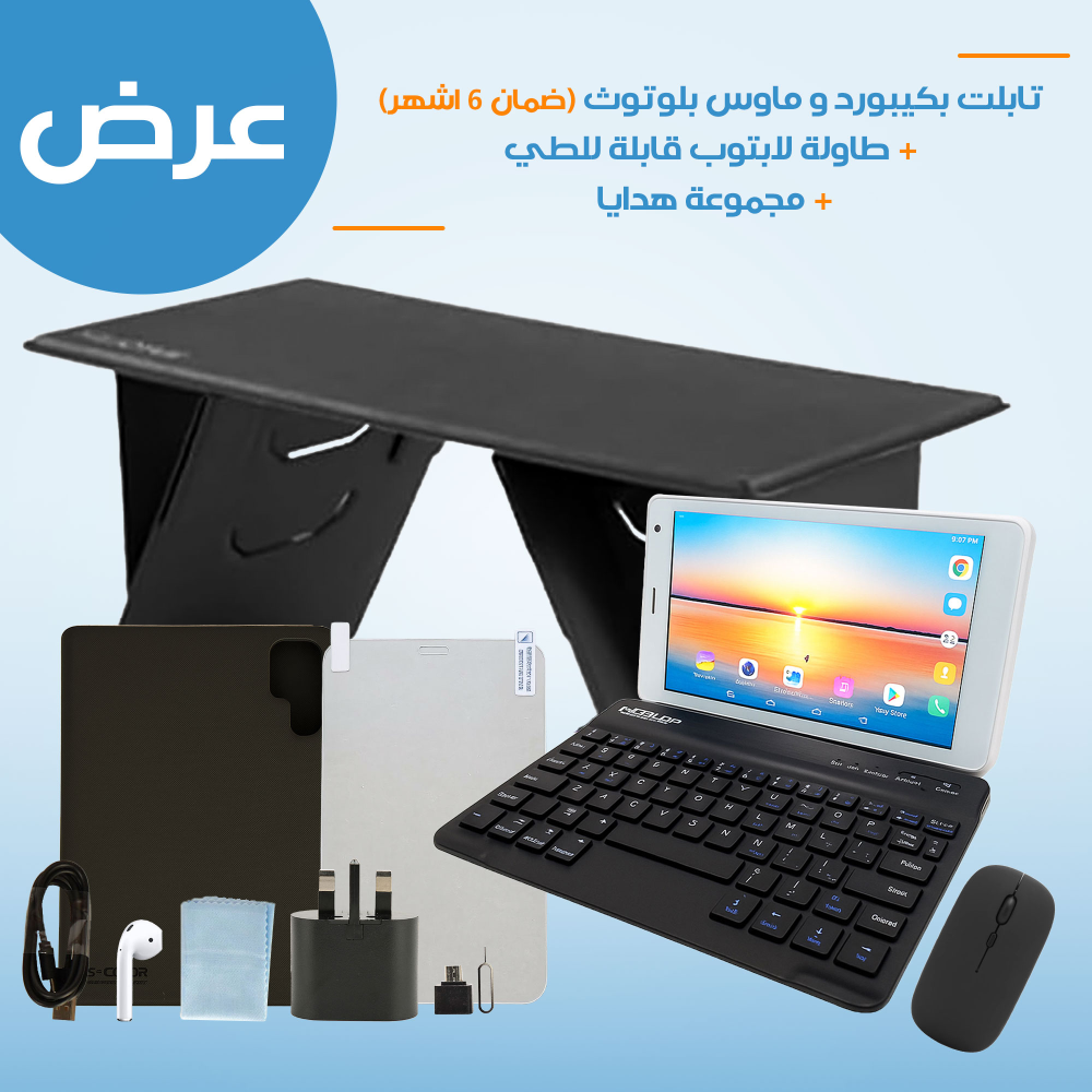 طاولة لابتوب قابلة للطي تقدم مع تابلت بكيبورد وماوس بلوتوث تجربة متكاملة تجمع بين الراحة والتنقلية مع ضمان 6 أشهر ومجموعة هدايا مميزة.